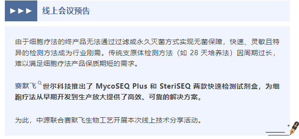 赛默飞世尔科技推出了MycoSEQ Plus 和 SteriSEQ 两款快速检测试剂盒,为细胞疗法从早期开发到生产放大提供了高效、可靠的解决方案。 为此,中源联合赛默飞生物工艺开展本次线上技术分享活动,就在明天下午2点,快来报名吧~2025-06-06 09:14:00.0