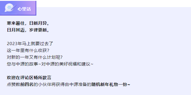 寒来暑往,日新月异。 日月其迈,岁律更新。 2023年马上就要过去了 这一年里有什么收获? 对新的一年又有什么计划呢? 您与中源的故事~对中源的美好祝福和建议~ 欢迎在评论区畅所欲言 点赞数前四名的小伙伴将获得由中源准备的随机新年礼物一份~2023-12-01 16:40:00.0