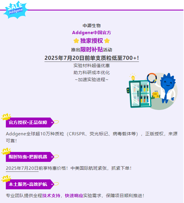 欧冠杯官方网站_欧冠(中国) Addgene中国官方 ⭐独家授权⭐ 推出限时补贴活动 2025年7月20日前单支质粒低至700+!实验材料超值优惠 助力科研成本...2025-05-16 09:24:00.0
