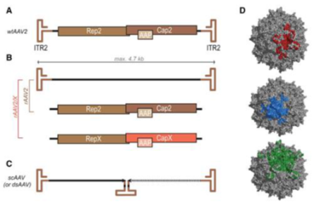 目前临床研究中采用的重组腺相关病毒载体(Recombination adeno-associated virus, rAAV)是在非致病的野生型AAV基础上改造而成的基因载体。利用rAAV可以将外源基因转入动物组织和细胞中,由于其种类多样、免疫原性极低、安全性高、宿主细胞范围广、扩散能力强、体内表达基因时间长等,rAAV被视为最有前途的基因研究和基因治疗载体之一。