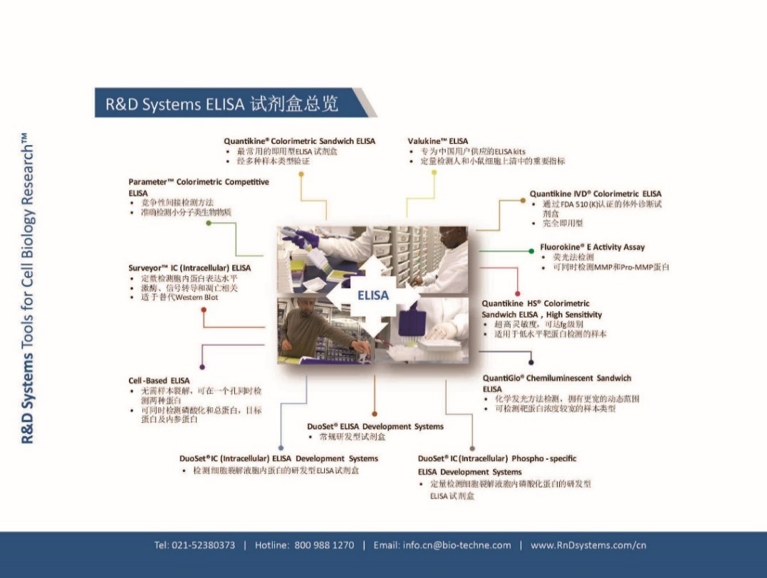 一个是传承30年抗体研发经验,专业成就绝佳品质的R&D Systems;它是一个全球性的细胞生物学资源库:优质的蛋白质,抗体,ELISA试剂盒,实验室试剂,和科研工具。R&D Systems公司拥有近30年致力于研发、测试和优化免疫分析试剂盒的经验,已成为世界公认的金标准。目前,提供超过2000多种ELISA试剂盒。