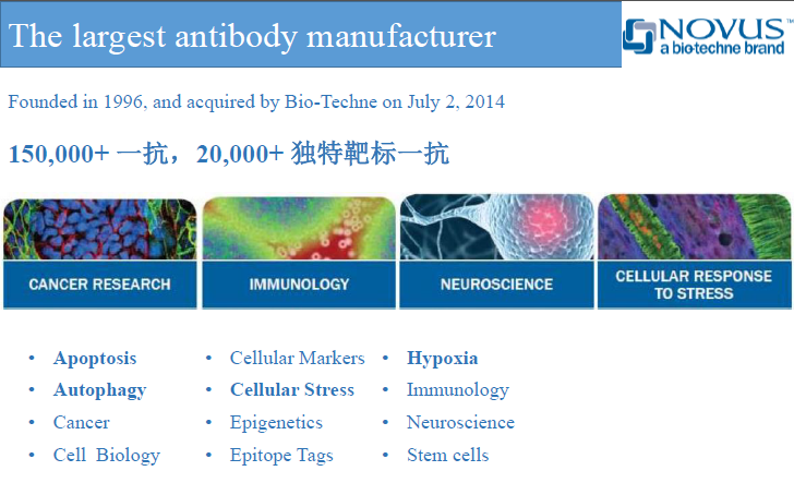 另一个是19万抗体应有尽有,全方位一站式服务标杆的Novus。它是一家位于专业的抗体生产公司,产品主要以抗体为主,涉及神经生物学,细胞凋亡,肿瘤,DNA修复,干细胞标记,信号转导等多个研究方向。多年的抗体生产服务经验,使Novus得以引领生物科学发展趋势,并可随时为生物科研工作者提供前沿并广泛的产品。