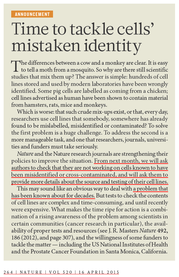 2015年4月16日,最新一期的Nature杂志(520期)发表了一篇名为“Time to tackle cells’mistaken identity”的社论。文章指出了正式发表的论文中使用错误细胞系的问题由来已久,且问题越来越突出。文章指出1/3的研究者获得细胞系的方式都是从另一个实验室以礼物的形式免费获得的。调查表明,超过400种广为使用的细胞系是被错误鉴定的。