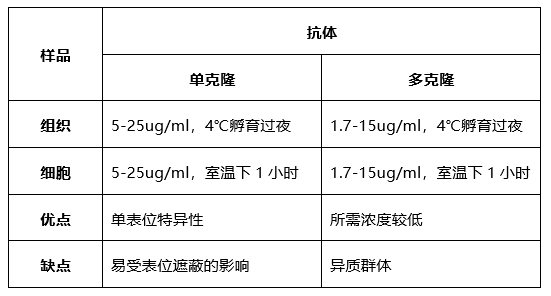抗体结合往往依赖于目标蛋白维持其天然的构象状态。与其他蛋白的相互作用、翻译后修饰、温度、pH、固定和盐浓度都会影响抗体接近目的表位。多克隆抗体是异质的,可识别多个表位,因此它们较少受到蛋白构象变化的影响。一般而言,多克隆抗体在一定pH和盐浓度范围内也比单克隆抗体更为稳定。基于这些原因,多克隆抗体更常用于IHC/ICC实验。