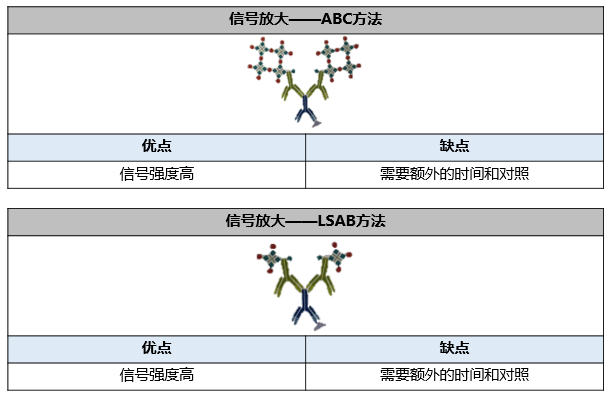 利用亲和素和链霉亲和素与生物素的强亲和力,可实现信号的进一步放大。亲和素是一种存在于蛋清中的糖蛋白,按化学计量与生物素结合。链霉亲和素纯化自链霉菌 Streptomyces avidinii ,未糖基化,表现出比亲和素更低的非特异结合。两种蛋白的每个分子都结合四个生物素。如果采用生物素化的二抗,那么通过与亲和素-生物素(ABC方法)或标记的链霉亲和素-生物素(LSAB 方法)的孵育可明显放大信号。链霉亲和素可与检测酶(辣根过氧化物酶或碱性磷酸酶)或荧光染料结合。使用这些放大方法需要额外的步骤来防止非特异结合。