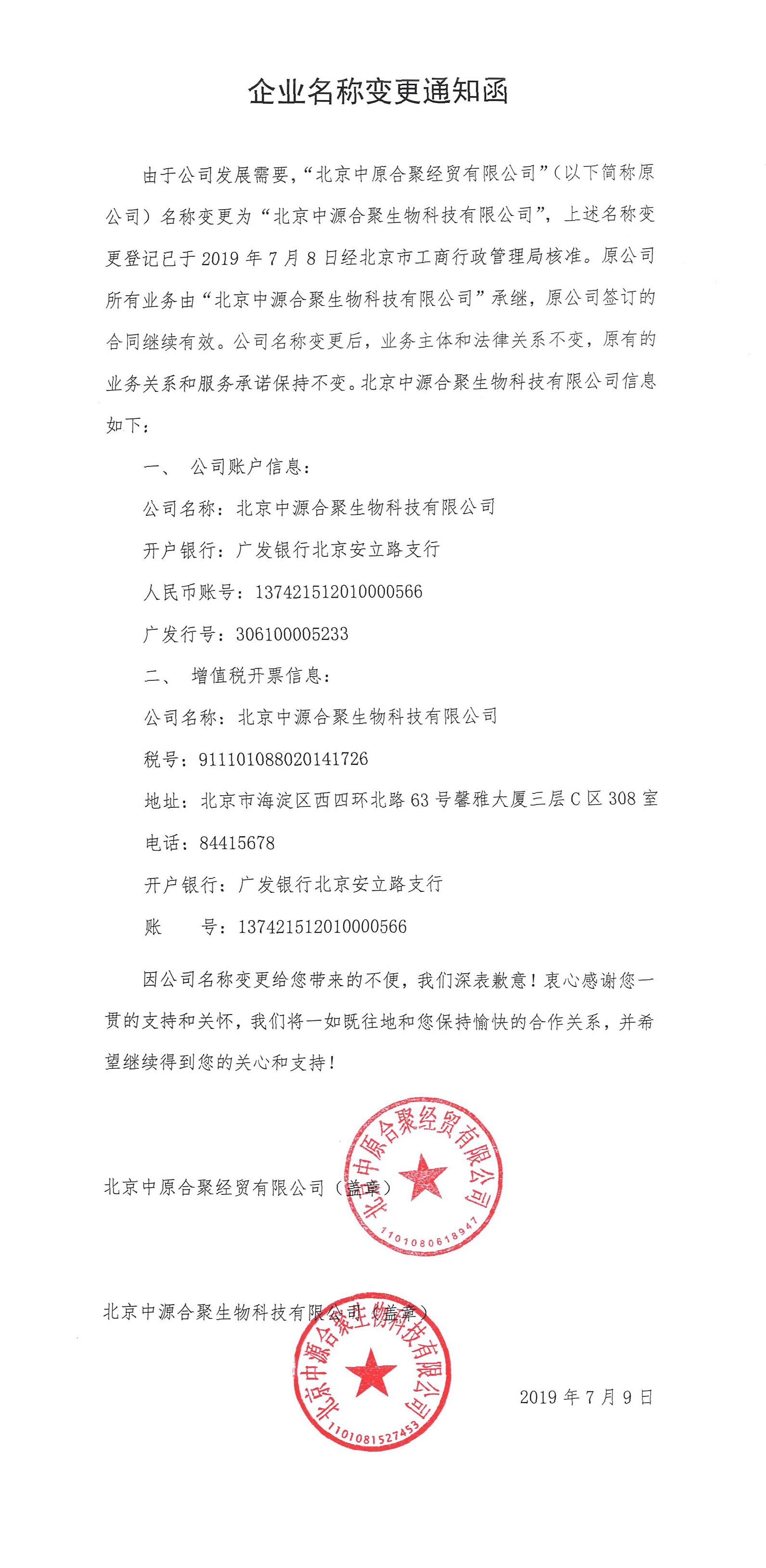 由于公司业务发展需要,“北京中原合聚经贸有限公司”(以下简称原公司)名称变更为“欧冠杯官方网站_欧冠(中国) ”。上述名称变更登记已与2019年7月8日经北京市工商行政管理局海淀分局核准。