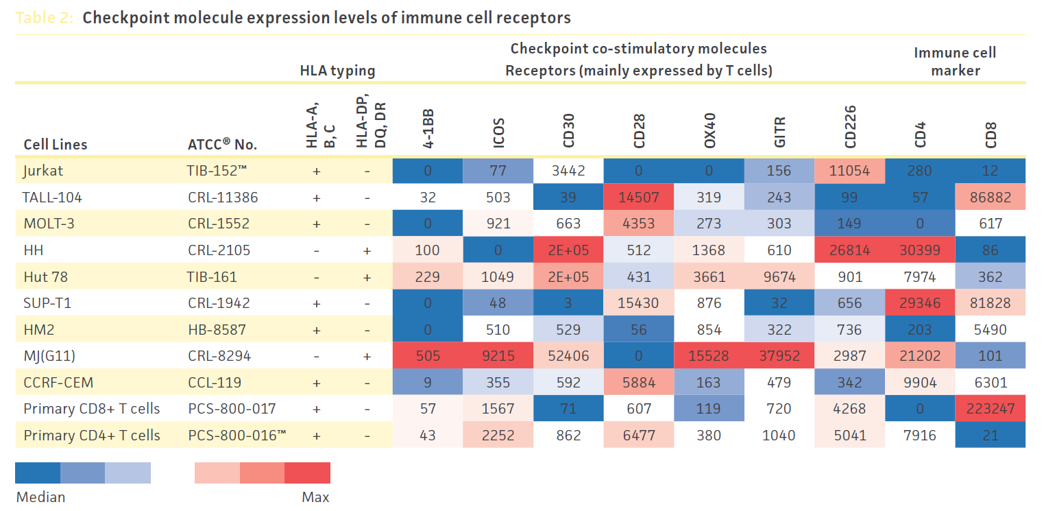 ATCC编制了一套关于各种肿瘤和免疫细胞系以及原代T细胞的检查点分子表达水平的综合数据集。这些经测试的细胞显示了检查点抑制和共刺激分子的高表达水平。这些已建立的细胞系可以整合到简单的阻断分析中,或整合到共培养测试系统中。