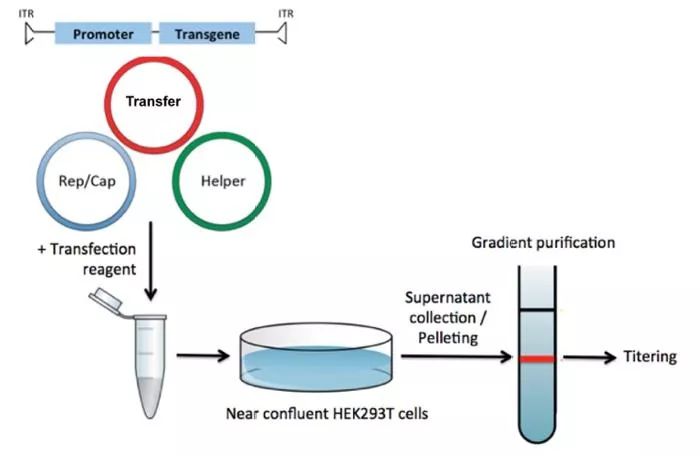 简而言之,您首先用携带目的基因的rAAV载体,腺病毒辅助质粒和含有Rep和Cap的质粒共转染HEK293T细胞(图2,通常称为“三重质粒转染”)。2-3天后,收集上清液(或在某些情况下需要制备细胞提取物,因为一些rAAV血清型被释放到培养基中,而其他类型则没有)(Vandenberghe et al),使用PEG从中沉淀病毒粒子。然后使用高速的超速离心机通过密度梯度离心进一步纯化病毒颗粒。由于其密度很高,病毒粒子会在分离液中形成一条带,你可以收集这条带。然后通过透析/缓冲液交换去除密度梯度离心液,并且如果需要可以进一步浓缩病毒粒子。