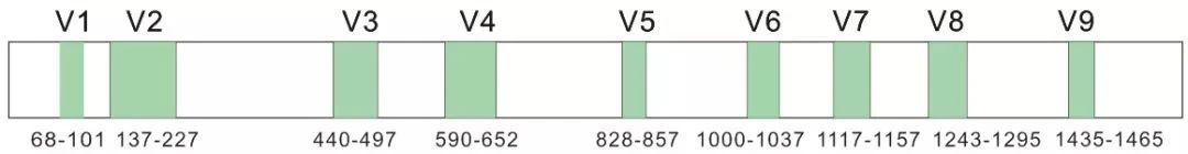 图3 16S rRNA序列示意图(大肠杆菌)绿色为高变区,白色为保守区