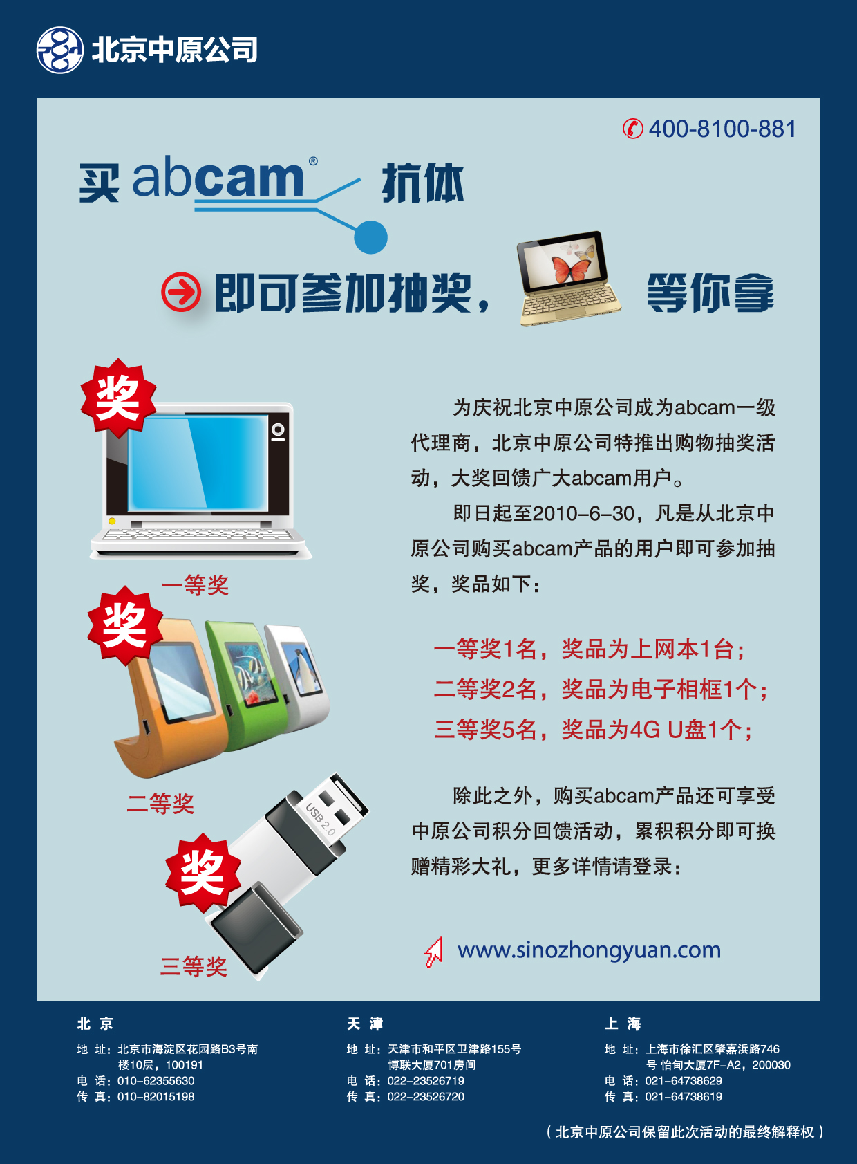 In order to celebrate Beijing Zhongyuan Ltd.becoming an abcam level agent, we launched a shopping lottery to reward the majority of users.2010-08-13 11:07:00.0