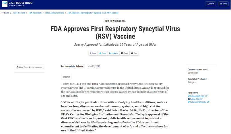 2023年5月3日,葛兰素史克(GSK)宣布其呼吸道合胞病毒(Human respiratory syncytial virus,RSV)疫苗Arexvy获美国食品药品监督管理局(FDA)批准上市,用于60岁及以上老年人群预防RSV感染导致的下呼吸道疾病(RSV-LRTD) 该产品也是全球首款获批上市的RSV疫苗。2023-06-09 13:55:00.0