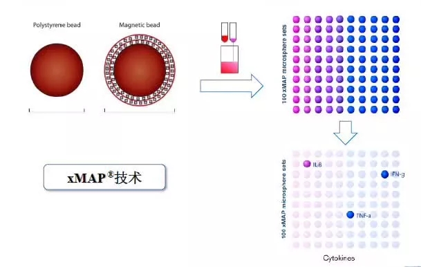 Luminex 技术应用微球和流式细胞仪的原理。微球内部含有两种不同颜色的免疫荧光,通过荧光不同的比例可以区分多达100种不同的微球。每种微球可以用来检测一种不同的蛋白或基因。因此,利用微球技术可以同时检测高达100个蛋白。该技术利用荧光编码的微球共价交联单克隆抗体,与被测定的目标分子结合后,加入荧光素标记的检测抗体,再通过激光扫描荧光编码来识别单个微球和测量“检测荧光”强度来确定被测分子的浓度。