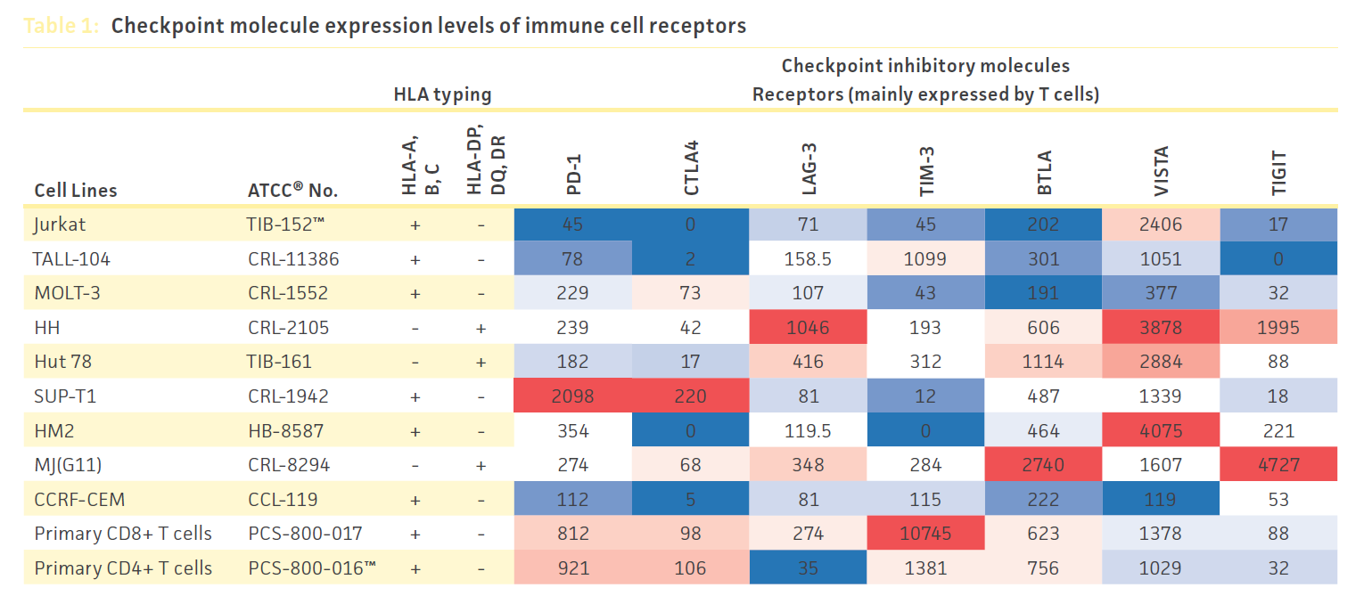 ATCC编制了一套关于各种肿瘤和免疫细胞系以及原代T细胞的检查点分子表达水平的综合数据集。这些经测试的细胞显示了检查点抑制和共刺激分子的高表达水平。这些已建立的细胞系可以整合到简单的阻断分析中,或整合到共培养测试系统中。