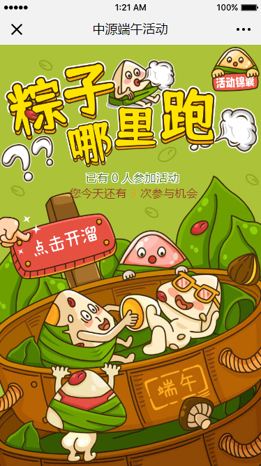 游戏玩法:把行走的粽子拖到下方,不要被筷子夹走哦!分数到达500分,即可获得抽奖机会,每位用户有三次参与机会。