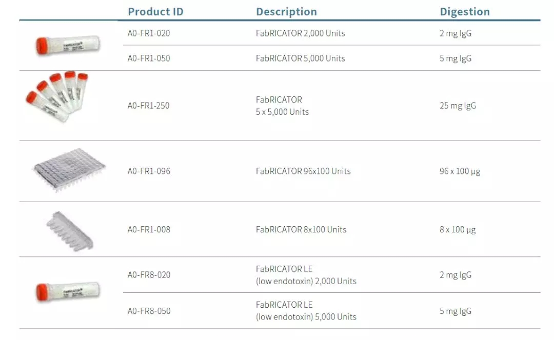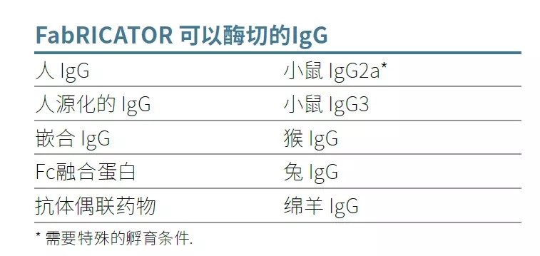 FabRICATOR® (IdeS)is a unique cysteine protease that cleaves IgG at a single amino acid site below the hinge region. The digestion reaction can be completed in only 30 minutes, and no condition optimization is required.